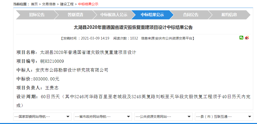 公司中標太湖縣2020年普通國省道災毀恢復重建項目設計